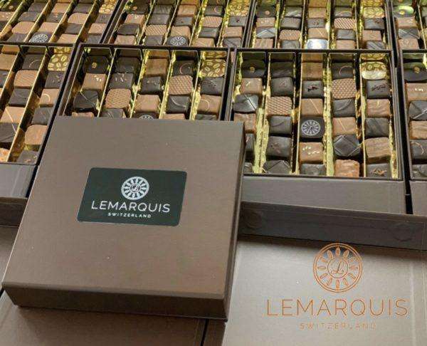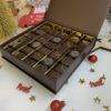 Ingrédients : chocolat noir 70%, 68%, 65% (sucre de canne, fèves de cacao, beurre de cacao, poudre de cacao, cacao 70%, 68%, 65% minimum, chocolat au lait 40%(sucre de canne, beurre de cacao, poudre de lait entier, fèves de cacao, vanille. Cacao 40% minimum), crème, beurre, sucre inverti, amande, noisette, cacahuète, sucre, beurre, de cacao, grué de cacao, orange, fruit de la passion, biscuit finement émietté (farine de blé, sucre, graisse végétale (tournesol, colza), beurre, lait, sel ; extrait de malt (orge), poudre à lever : E500, lécithine de tournesol, antioxydant : E306), whisky, gingembre, citron, sorbitol, thé vert, café, cannelle, fèves de tonka, vanille, poudre scintillante.